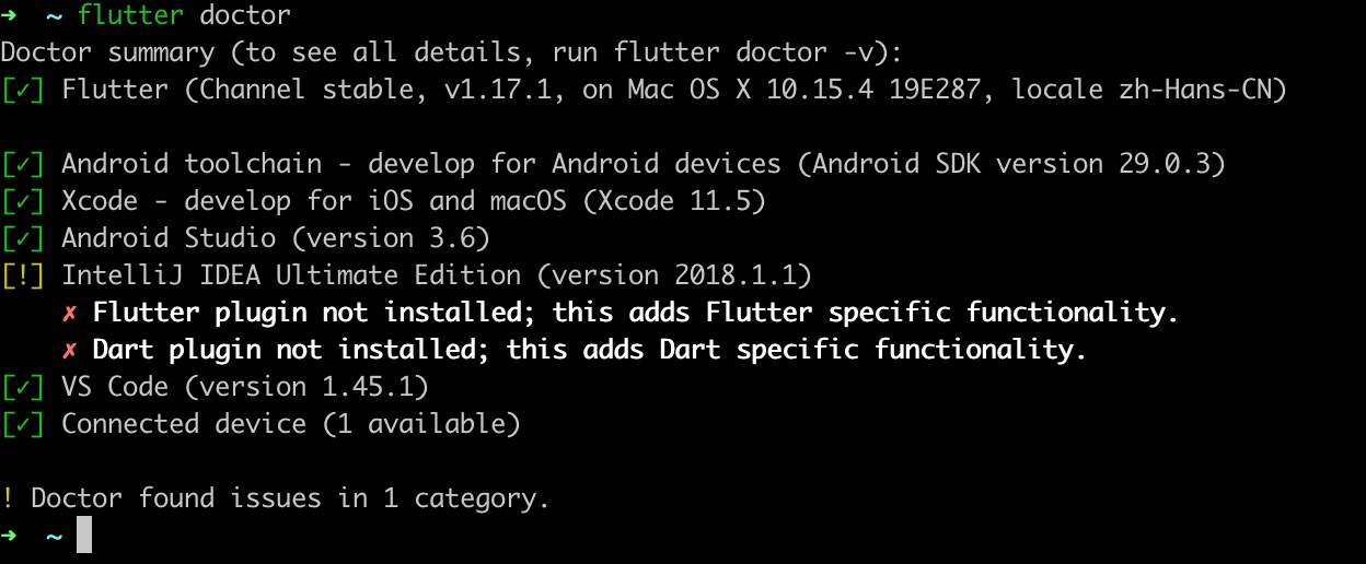 该指令用于检测Flutter环境,下图展示我的已经配置好的状态: