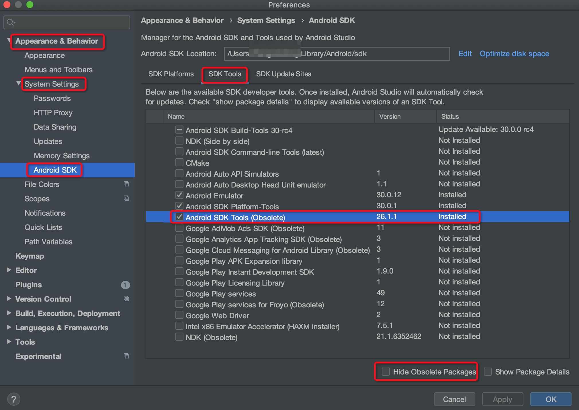 勾选掉下方的Hide Obsolete Packages,在列表中选择安装Android SDK Tools(Obsolete)