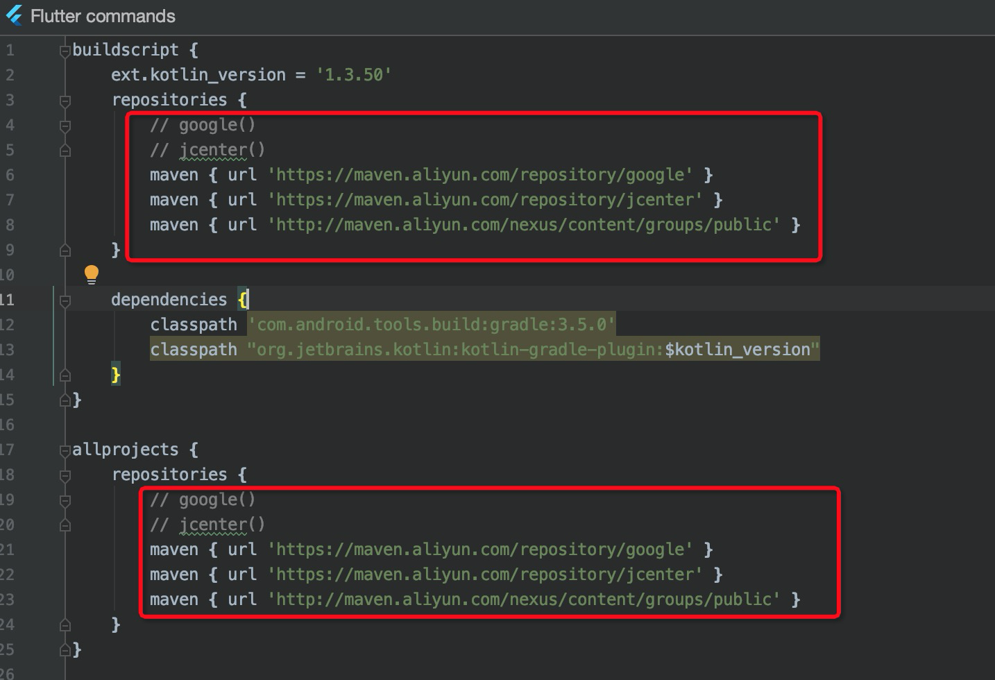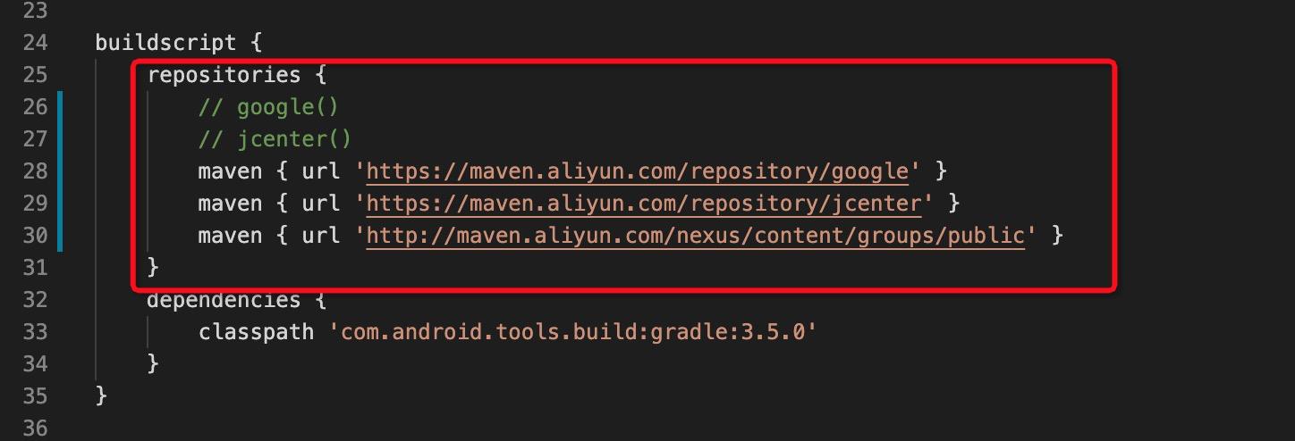 - 修改内容:找到buildscript和allprojects,将里面的