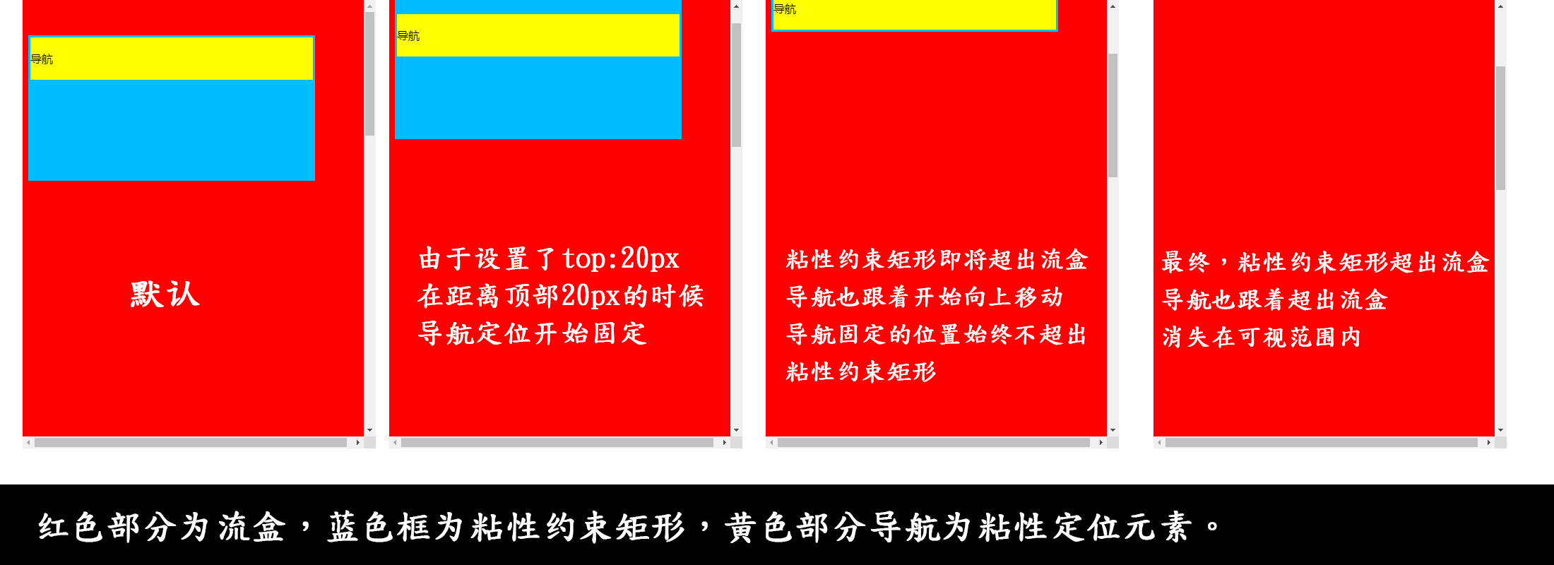所以,如果粘性定位元素的高度如果和粘性定位的父元素高度相等的话,粘性定位元素在粘性约束矩形中将会没有实现粘性效果的活动空间,随着粘性约束矩形消失在可视范围内时,粘性定位元素也将会一同消失在可视范围内,也就是所谓的失效效果。