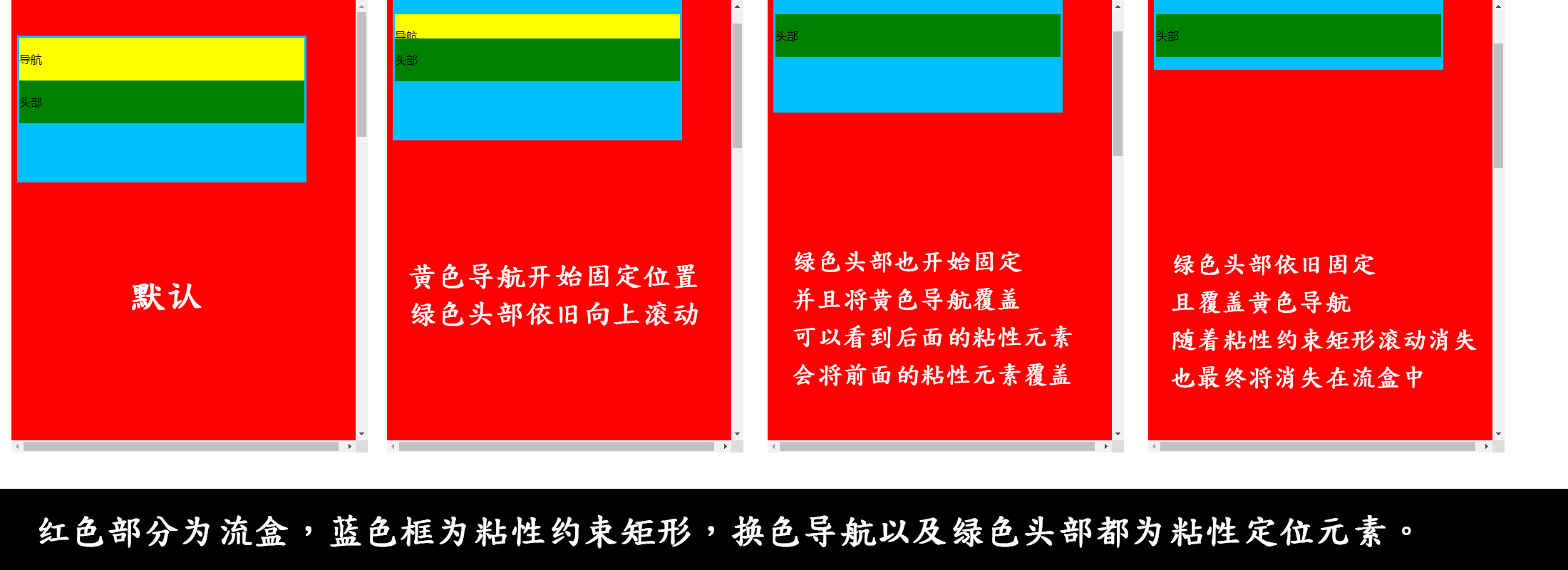 overflow属性设置了scroll,auto,overlay值,那么,粘性定位将会失效 - 同一容器中多个粘贴定位元素独立偏移,因此可能重叠;位置上下靠在一起的不同容器中的粘贴定位元素则会鸠占鹊巢,挤开原来的元素,形成依次占位的效果。