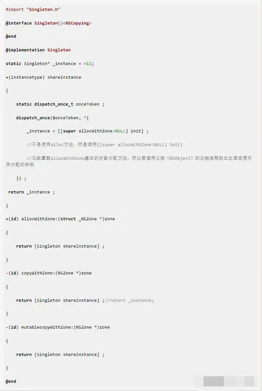 那么怎么写单例呢? 核心的一点就是, 我们平时创建一个实例对象时候用到的方法(alloc, init), 都要重写一遍,保证使用这些方法创建对象的时候是只分配一块内存地址,然后第一次创建之后再创建都指向前边已经创建过得那个内存地址,顺着这个思路,代码如下: