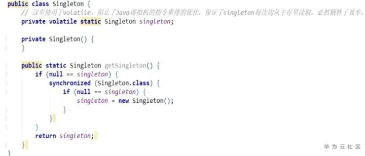 DCL双重加锁的方式保证每次调用getSingleton方法的时候都是同步的。其实加锁大家都能理解,就是解决多线程同步的问题。但其实这里有个重点,就是这行代码: