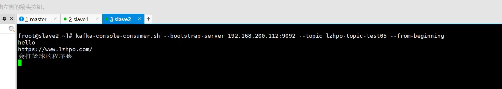 # 在slave2节点启动消费者consumer,监听lzhpo-topic-test3的topic