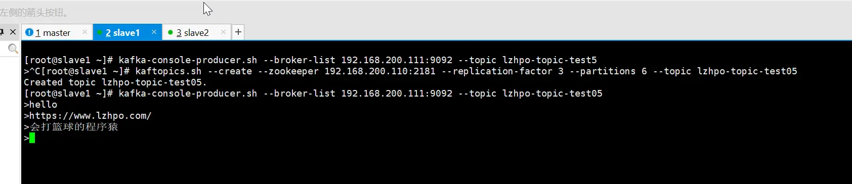 [root@slave1 ~]# kafka-console-producer.sh --broker-list 192.168.200.111:9092 --topic lzhpo-topic-test05