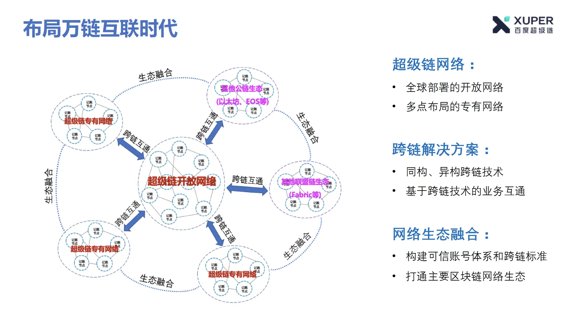 “跨链”指将同构或异构的区块链系统连接起来,实现资产、数据的操作。百度资深研发工程师王玉操介绍,不同类型数字货币兑换其实就是最早的跨链原始驱动力,之后智能合约的出现,带来联盟链、行业链数量井喷。但人们发现链间智能合约、共识算法、密码体系等机制差异很大,导致大量数据无法打通互认,形成数据孤岛,彼此的价值体系难以统一,而跨链技术真正满足了数据确权和价值传递这两大需求,让价值互联网得以变成现实。例如,应用了百度超级链技术的北京互联网法院“天平链”将受理的4万件案件全部上链,电子数据超过900万条,跨链存证数据量已达上亿条,解决了互联网审判当中电子证据的取证难、存证难、认定难的问题,就是非常典型的跨链案例之一。而在未来,随着跨链标准和技术进一步完善,数据互通已不再是问题,大型区块链生态的融合将推动价值互联网的继续发展,届时真正全球化、全局通用的价值互联网将形成。王玉操认为,要实现这一目标,跨链技术需要满足标准化、易用化和融合化,对此,百度超级链通过其全球部署的开放网络、多点布局的专有网络,以及各类跨链解决方案和网络生态融合方案,让更多的企业、更多的区块链应用都能加入这个价值互联网的生态中来。
