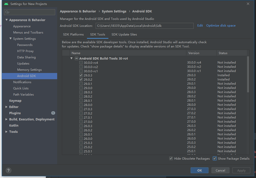 Android: License for package Android SDK Build-Tools **.*.*not accepted 南渡北归 2020-05-28 665 阅读1分钟 百度上找到的都是针对旧版本的解决方案,这里分享一下最新版本的方法 1.打开SDK manager 2.在sdk tool中勾选:show details,然后勾选所需要的版本号。比如我之前只勾选了29.0.3, 编译版本是29.0.2, 勾选后编译 3.解决