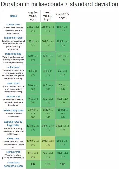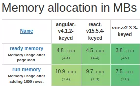 可见,这些性能测试显示,Vue 比 React 占用的内存更少,运行速度更快。