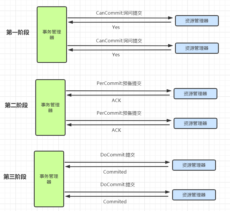 - 在第一阶段和第二阶段都加入一个预准备阶段,以保证在最后的任务提交之前参与的节点的状态是一致的。也就是说,除了引入超时机制,三段式提交协议(3PC)把二段式提交协议(2PC)再次一分为二,这样3PC就有