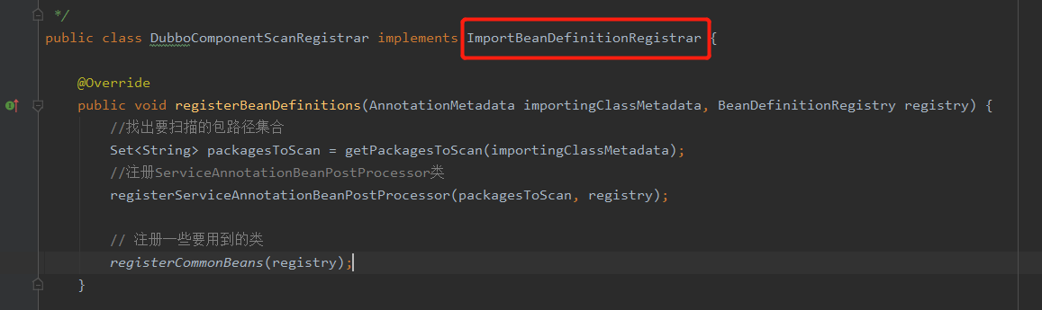 EnableDubbo内含有注解@DubboComponentScan,而@Import(DubboComponentScanRegistrar.class)包含在注解中,那让跟进去看看这个class类做了什么