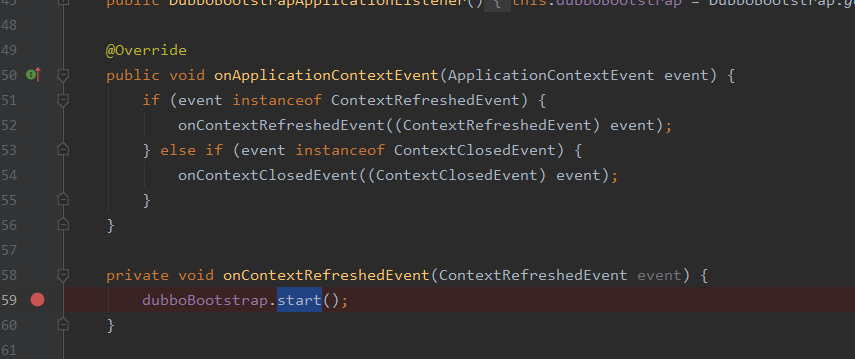 DubboBootstrapApplicationListener实现了aplicationListener,在spring contextRefreshed事件结束后执行,走到DubboBootstrap的start方法开始dubbo的初始化服务发布之路