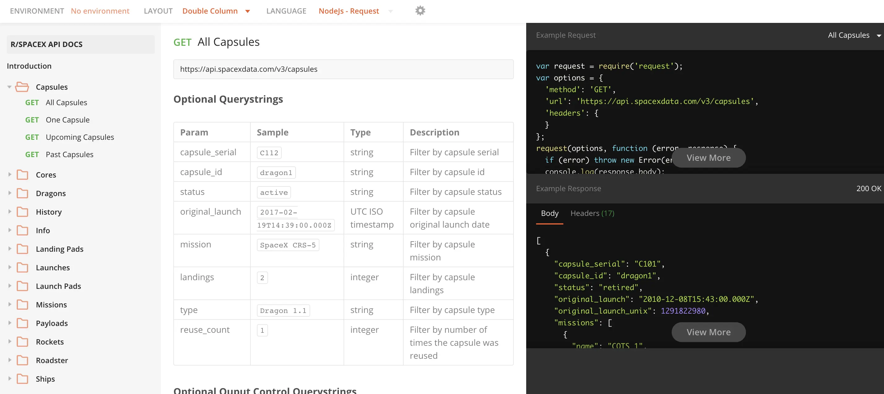 https://docs.spacexdata.com 展示了所提供的 API 接口,还包括多种语言的接口调用,下图右侧展示 Nodejs 的调用示例及相应返回值。