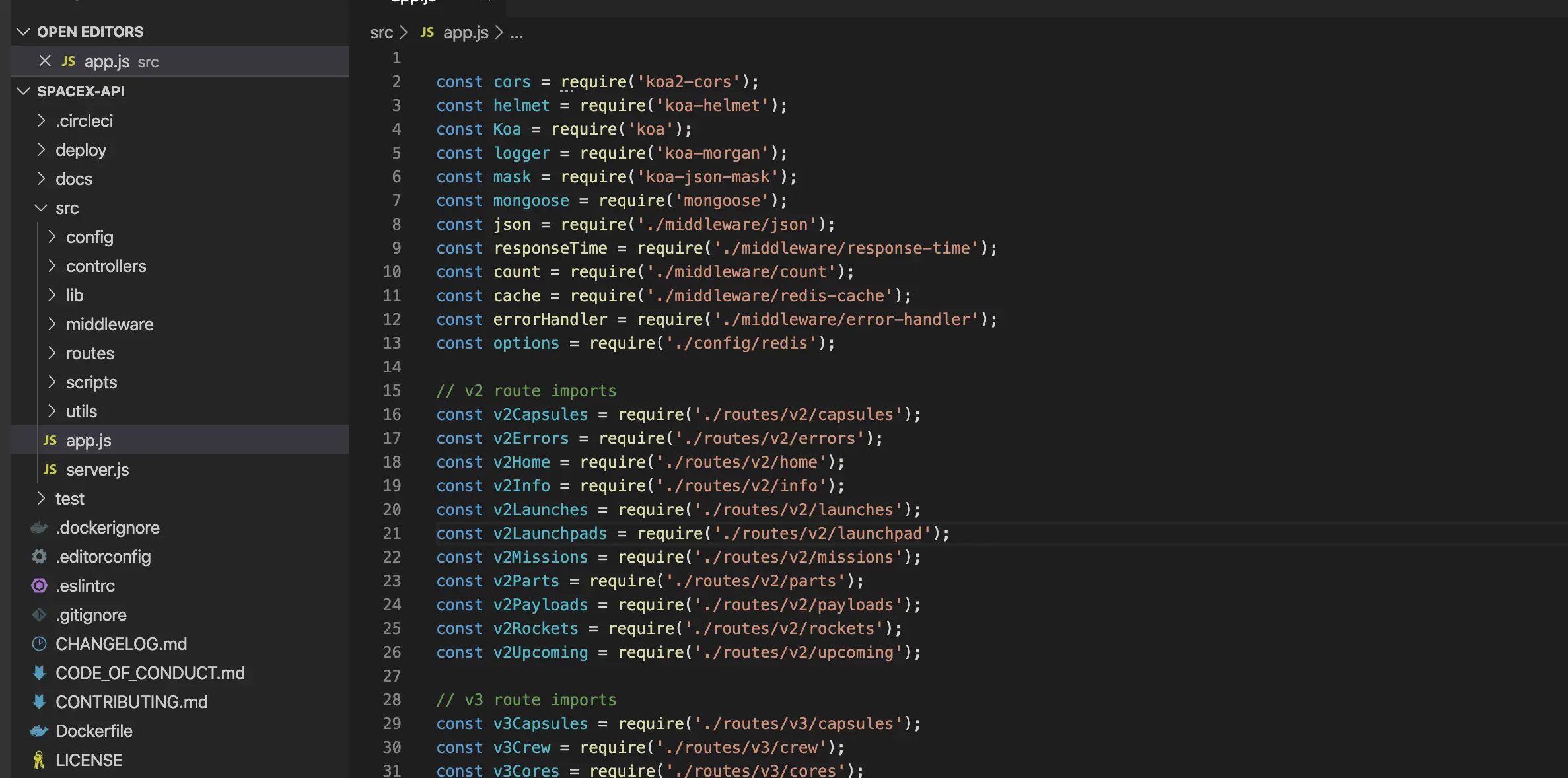 上图展示了 SpaceX-API 的目录结构,可以看到使用到 koa、mongoose 还有 ioredis 等,文末阅读原文你可以学习它们在该项目中是如何使用的。