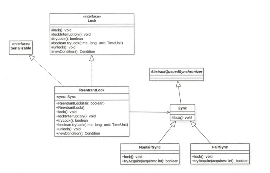 ReentrantLock 是可重入的独占锁,是用 AQS 来实现的,以下是其类图结构。