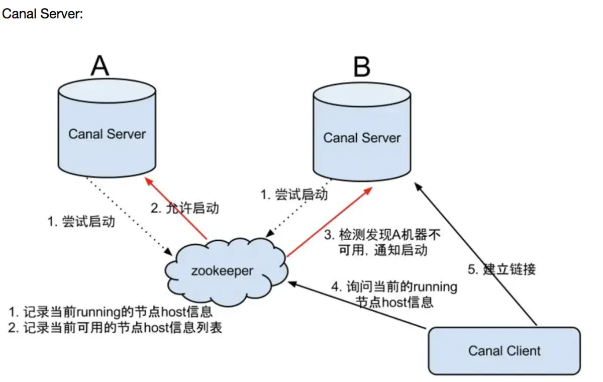 Canal现在的架构是单机消费,就算是高可用架构,为了保证binlog消费的顺序,依然是单机高可用,也就是在一台消费者挂了之后在其他待命的消费者中启动一台继续消费。(这个是目前版本我的理解,以后或许会有并发消费的新版本出来。)可以看下图: