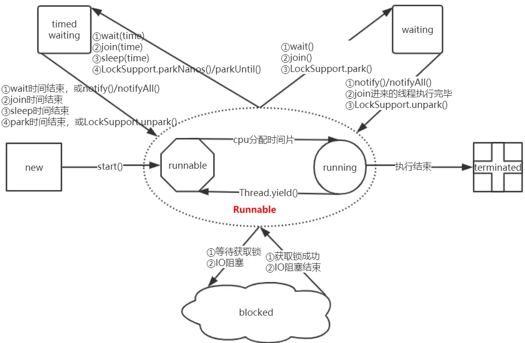 注意:在有些书籍(如《Java并发编程实战》中5.4章节)或笼统的称呼中,就将阻塞、等待和超时等待这三种状态统称为阻塞状态。