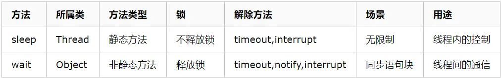 | 睡眠 | 让出CPU的使用权让其它线程执行 | 不会释放锁 | 让出CPU的使用权 |