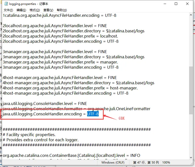 - 找到如下位置,将 "UTF-8" 替换为 "GBK",因为window系统默认是GBK。