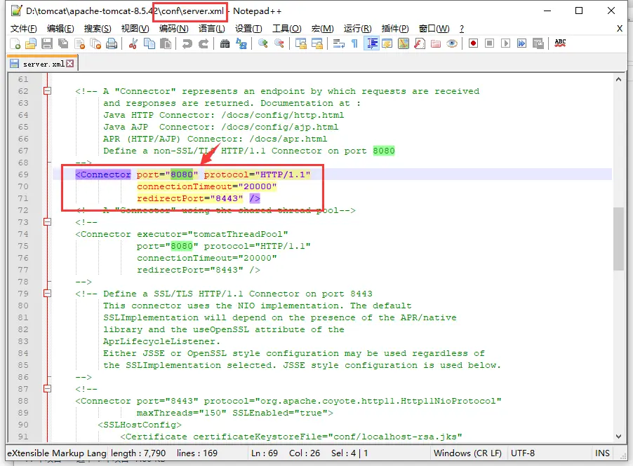 - 如果访问不了显示404错误,可能是你的进程端口被占用了,打开/conf/server.xml文件,在如下位置将8080修改为其他未占用端口号,启动Tomcat即可。