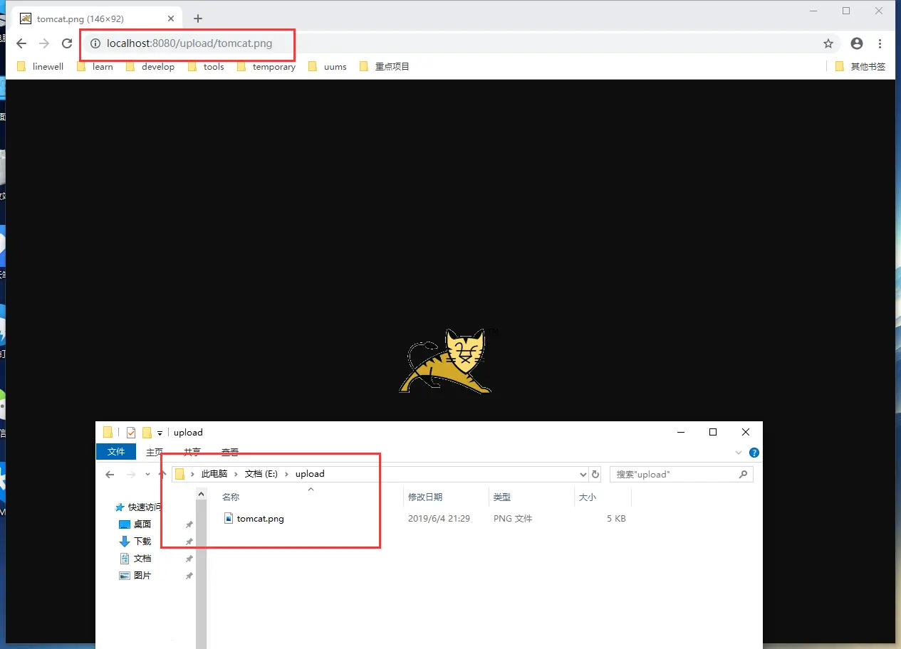 - 在E:\upload\文件夹下放置一张tomcat.png图片,然后在浏览器里输入http://localhost:8080/upload/tomcat.png进行访问,如果图片能正常访问,那就说明成功了。