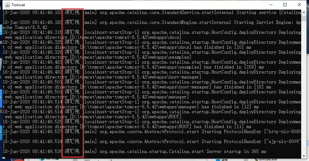 - 如下图,Tomcat已经启动成功,但是出现了中文乱码问题,虽然不影响操作但是美观很重要。