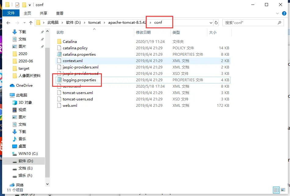 - 进入/conf文件夹下,打开logging.properties文件。