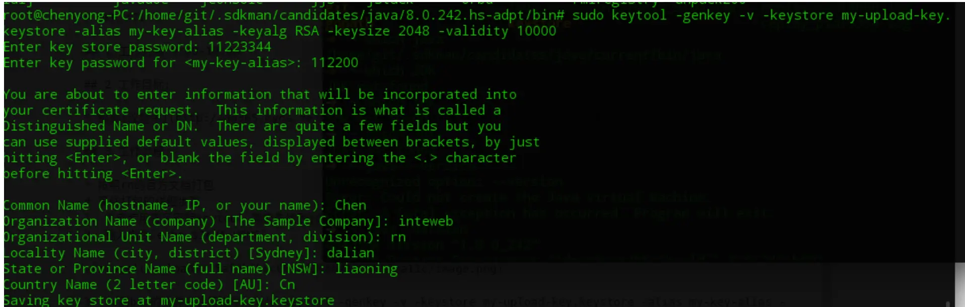 sudo keytool -genkey -v -keystore my-upload-key.keystore -alias my-key-alias -keyalg RSA -keysize 2048 -validity 10000 - 添加一些信息和设置秘钥的密码