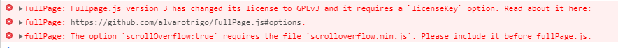 showError('error', 'Fullpage.js version 3 has changed its license to GPLv3 and it requires a `licenseKey` option. Read about it here:');
