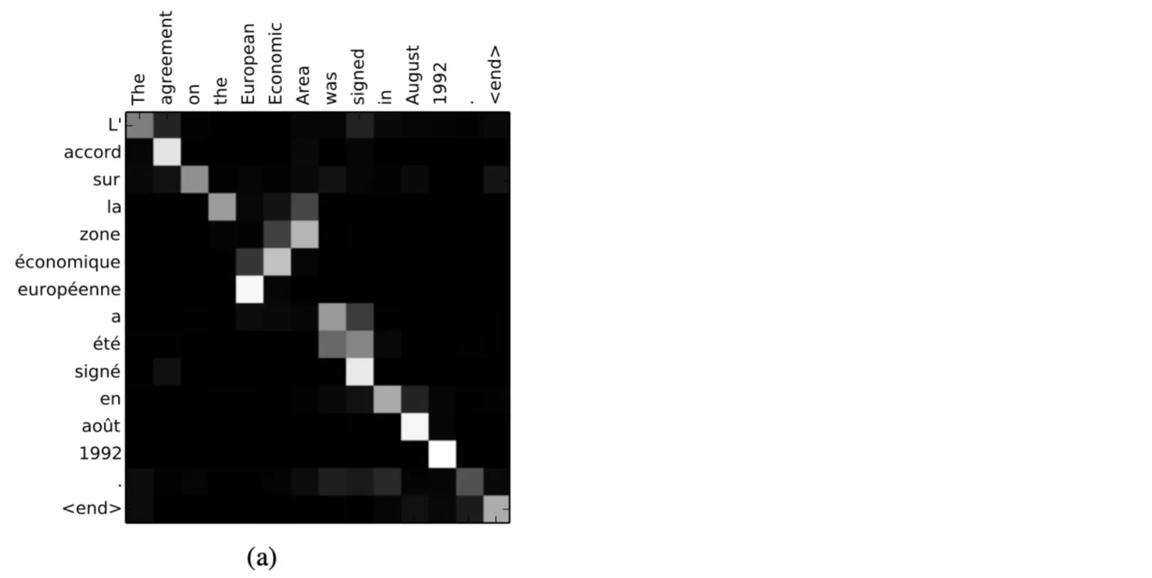 每一个小格的明暗度代表了对应纵横刻度的两个词的权重, 越亮表示权重越大, 在翻译时贡献的信息越多。
