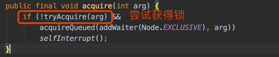 如果 tryArquire方法返回false,则acquire方法会继续调用acquireQueued(addWaiter(Node.EXCLUSIVE), arg)。