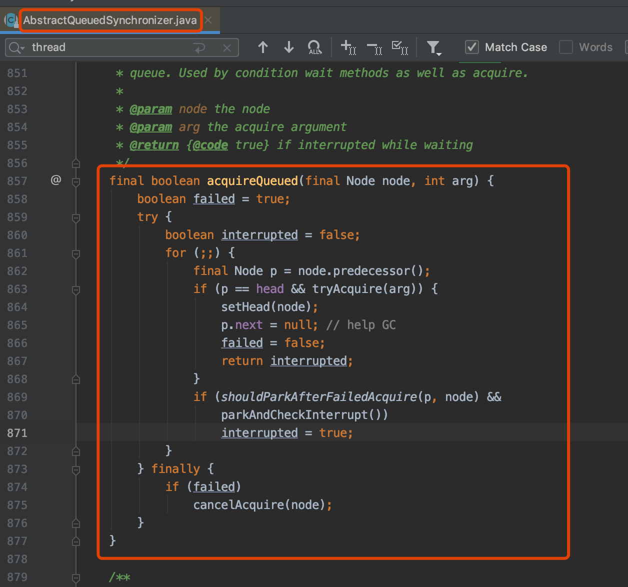 在当如等待队列之后,调用 acquireQueued 来尝试获取锁,其代码为
