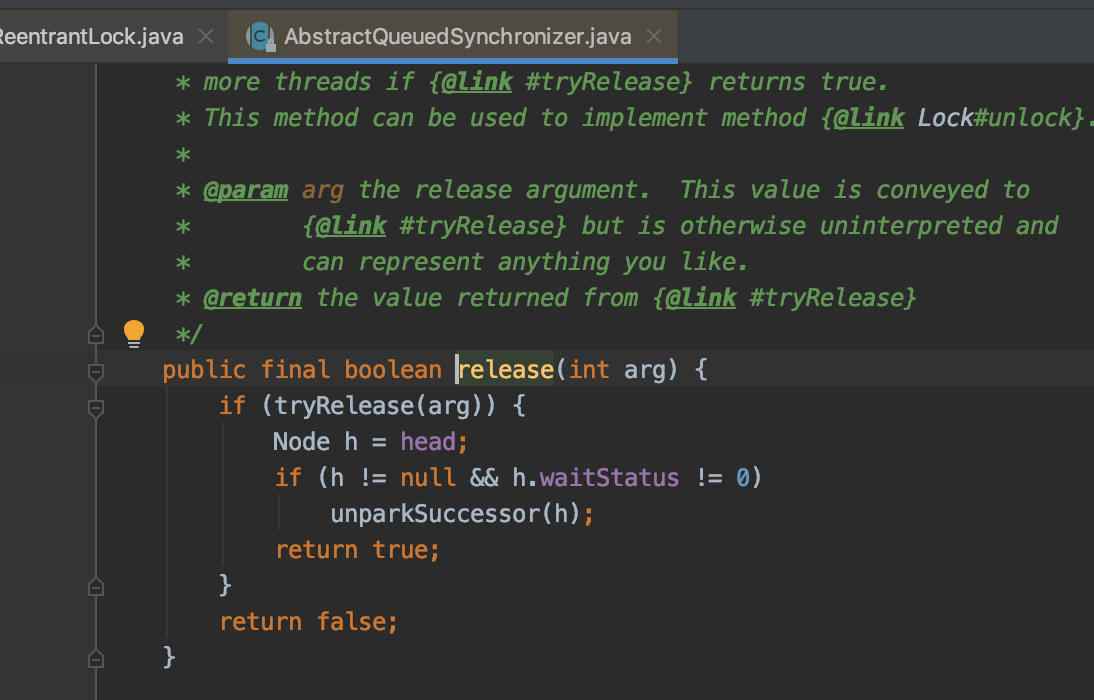 tryRelease 方法会修改线程状态并且释放锁, unparkSuccessor 方法会调用 LockSupport.unpark 将第一个等待的线程唤醒