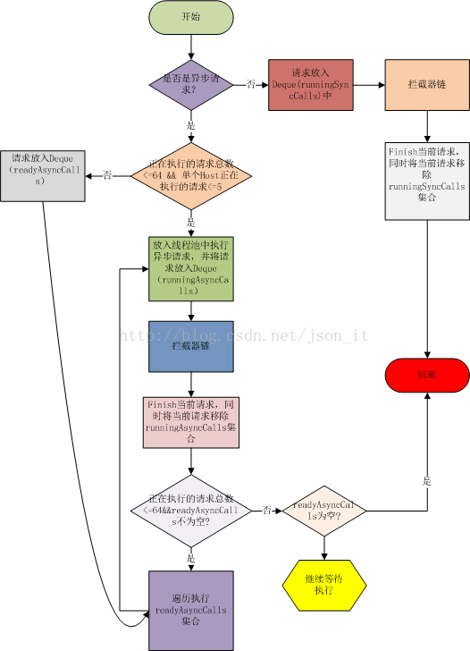 小篇结:本篇中以Okhttp的用法为主线,探究了它的同步请求、异步请求的代码逻辑。而OkHttp最主要的设计模式:责任链模式也在其中有涉及到。最后,我们通过2张图片来理解同步和异步的整个请求流程(图片不是本人画的):