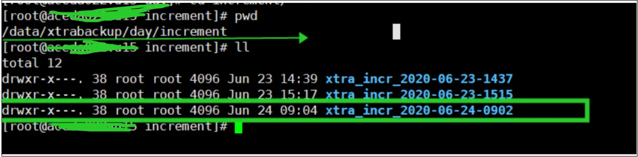 - innobackupex --apply-log /tmp/xtra_full_2020-06-23-1432/ --incremental-dir=/data/xtrabackup/day/increment/xtra_incr_2020-06-24-1026