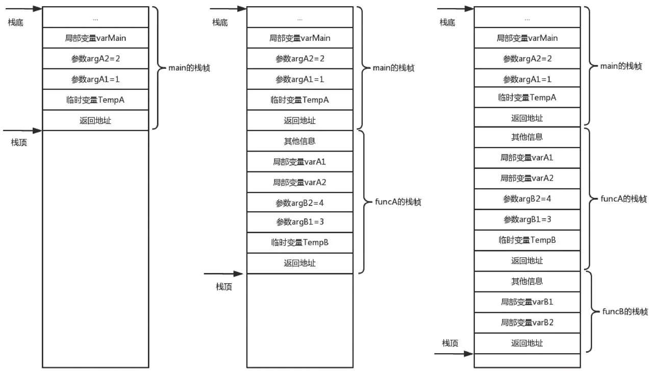 这段代码运行时,首先main函数会压栈,局部变量varMain入栈,main函数调用funcA函数,C语言会从后往前将函数参数压栈,先压第二个参数argA2=2,再压第一个参数argA1=1,同时对于funcA的返回会产生一个临时变量等待赋值,也会被压栈,这些称为main函数的栈帧;接着将funcA压栈,同样先将局部变量varA1和varA2压栈,因为调用了函数funcB,会将参数argB2=4和argB1=3压入栈中,同时将funcB的返回产生的临时变量压入栈中,这部分称为funcA的栈帧;同样,funcB被压入栈中。函数调用压栈过程示意图如图11-3所示。