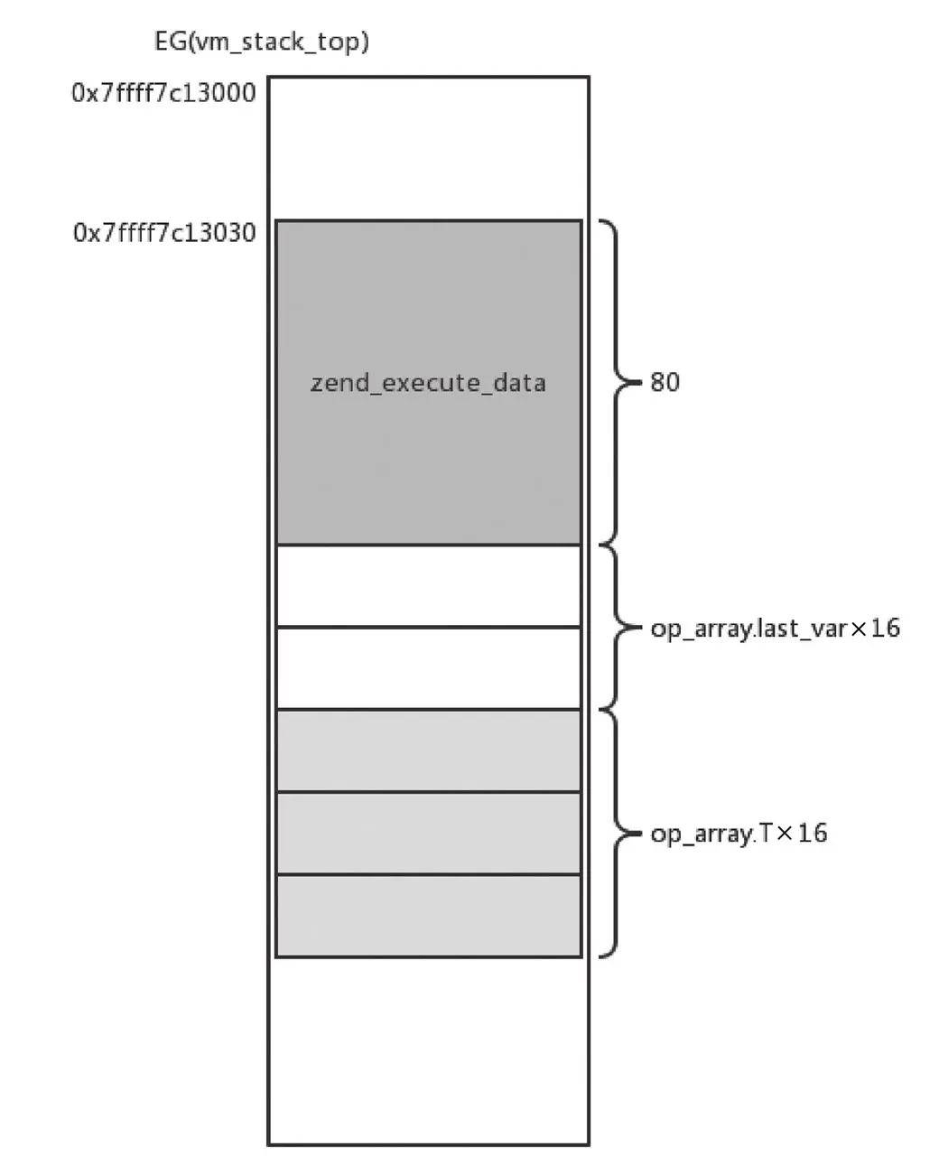 执行栈是通过11.2.6节介绍的zend_vm_stack_push_call_frame完成的,会在EG(vm_stack)上分配一块内存区域,80字节用来存放execute_data,紧接着下面是根据last_var和T的数量分配zval大小的空间,以11.3节编译生成的指令集为例,分配的栈如图11-20所示。
