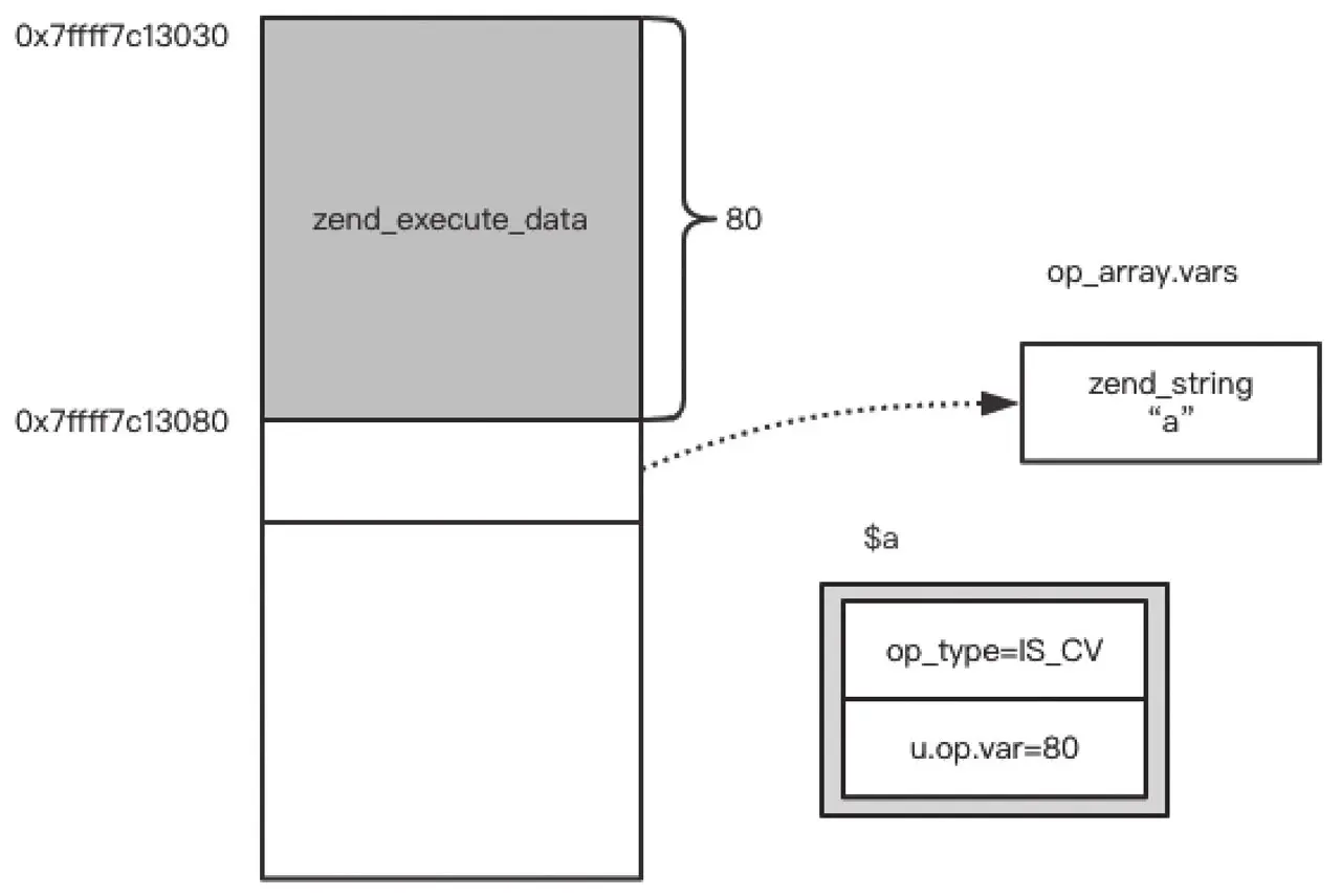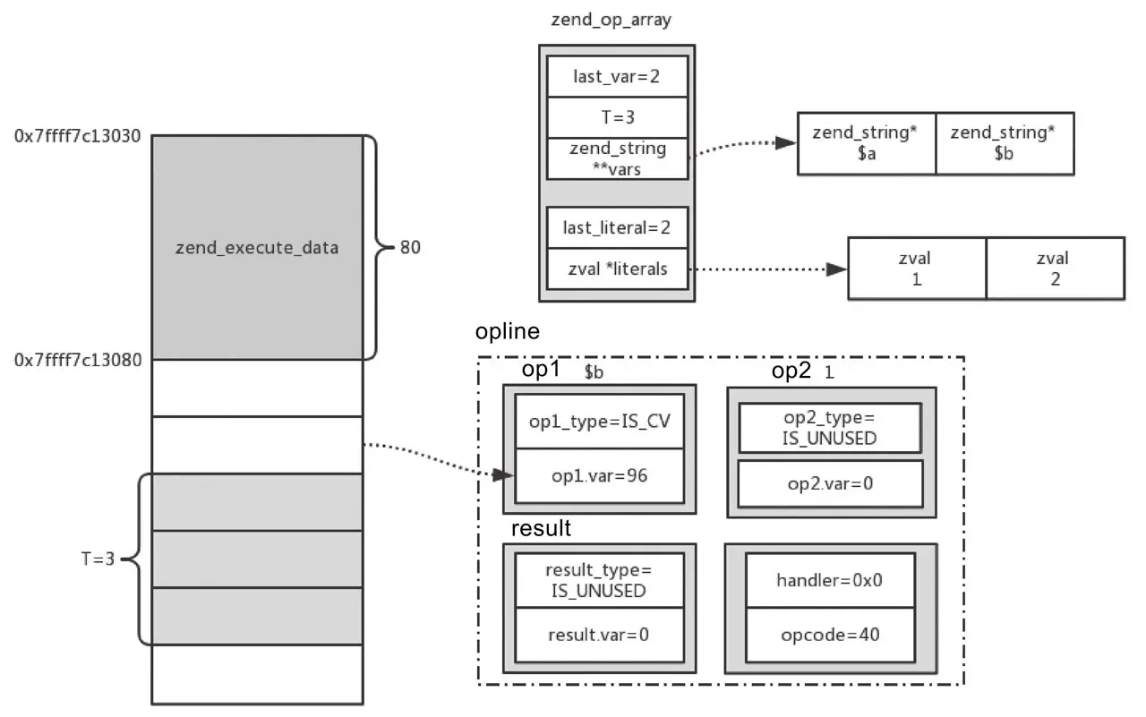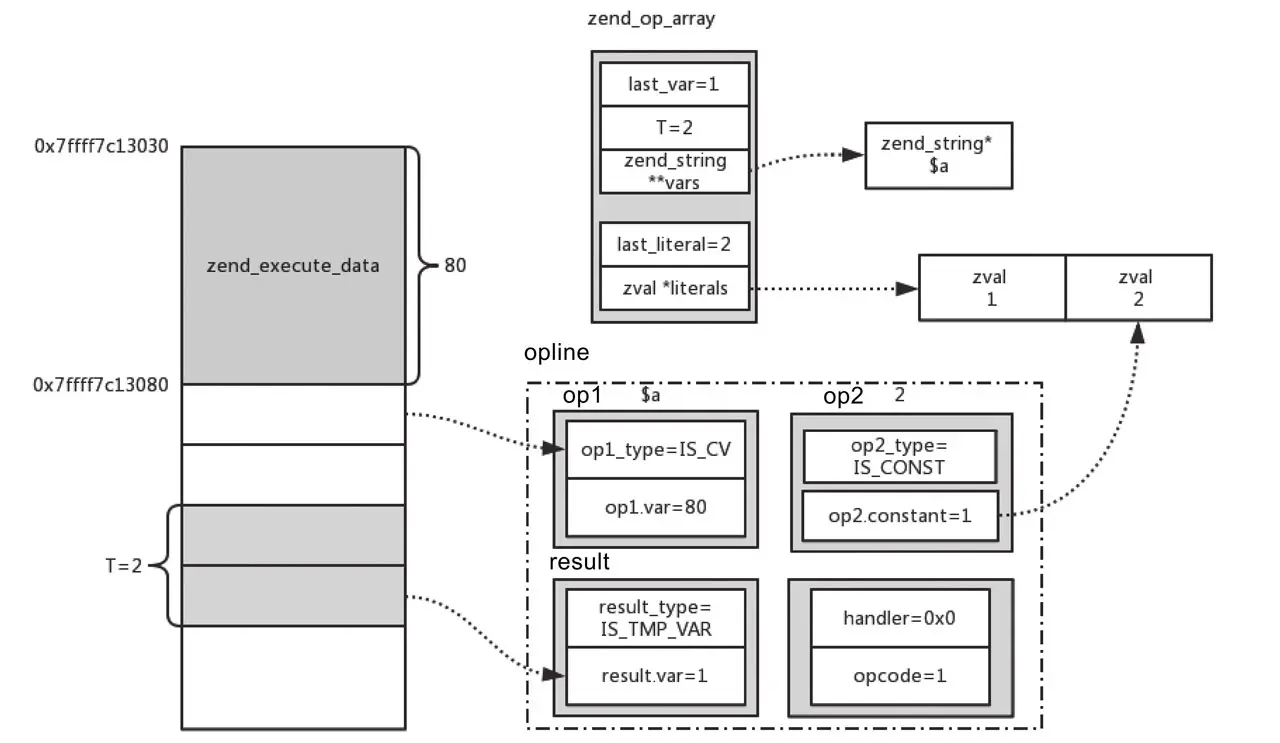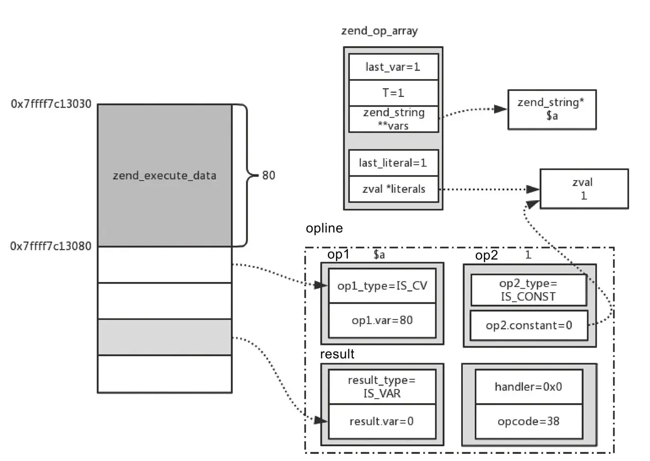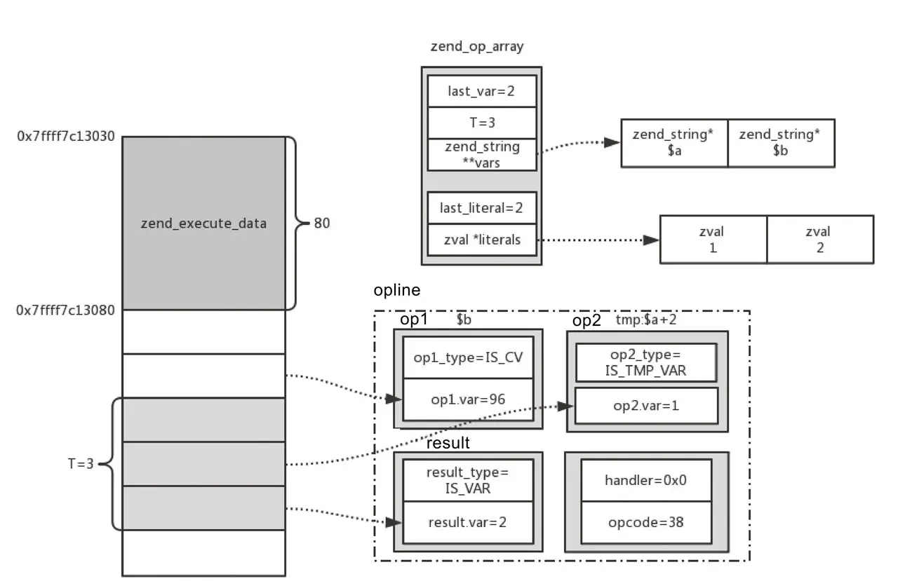 对于op1和op2,如果其是IS_VAR或者IS_TMP_VAR类型的变量,可以通过ZEND_CALL_VAR_NUM计算偏移量。