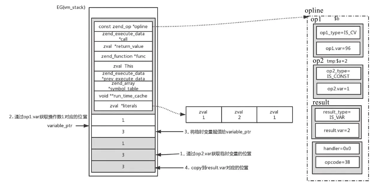 //ZEND_ASSIGN_SPEC_CV_TMP_RETVAL_UNUSED_HANDLER zval *value; zval *variable_ptr; //根据op2.var获取临时变量的位置 value = _get_zval_ptr_tmp(opline->op2.var, execute_data, &free_op2); //根据op1.var获取操作数1 的位置 variable_ptr = _get_zval_ptr_cv_undef_BP_VAR_W(execute_data, opline->op1.var); //将临时变量赋值给操作数1对应的位置 value = zend_assign_to_variable(variable_ptr, value, IS_TMP_VAR); //同时复制到result对应的位置 ZVAL_COPY(EX_VAR(opline->result.var), value); ZEND_VM_NEXT_OPCODE_CHECK_EXCEPTION();与第一条指令类似,执行过程如图11-24所示。