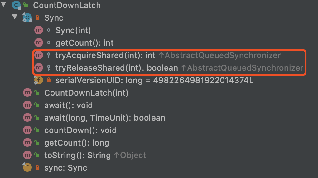 CountDownLatch,它就在Sync中实现了AQS的获取和释放方法: