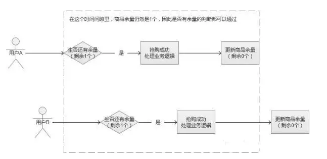 假设某个抢购场景中,我们一共只有100个商品,在最后一刻,我们已经消耗了99个商品,仅剩最后一个。这个时候,系统发来多个并发请求,这批请求读取到的商品余量都是99个,然后都通过了这一个余量判断,最终导致超发。(同文章前面说的场景),在下面的这个图中,就导致了并发用户B也“抢购成功”,多让一个人获得了商品。这种场景,在高并发的情况下非常容易出现。