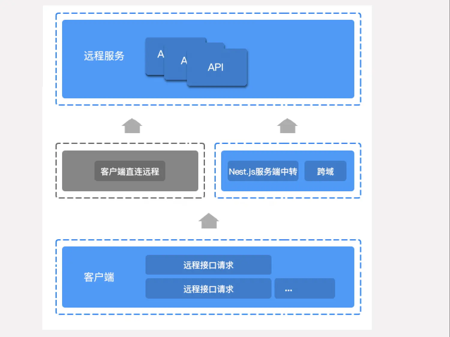 这里讨论的是Nest.js中转的方式进行,一般来讲,如果API不需要跨域,则只需要前端直接发起请求即可。但如果API是跨域,在这里示例中使用的是Nest.js中转的方式进行,同时使用中转也能统一请求出口入口,鉴权,请求参数监控和日志监控等的统一处理。本示例中使用到的服务远程调用主要围绕axios组件使用展开。