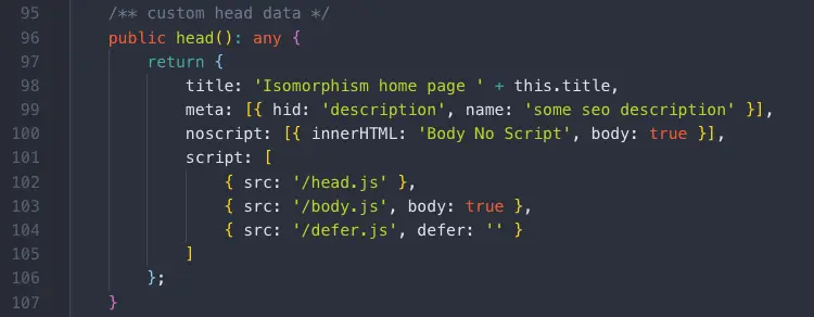 Nuxt.js会读取head属性作为TDK默认值,在TypeScript版本中需要定义函数类实现,例如: 该函数返加TDK,或者另外定义的头部内容,需要单独引入先行执行的JS等。 -