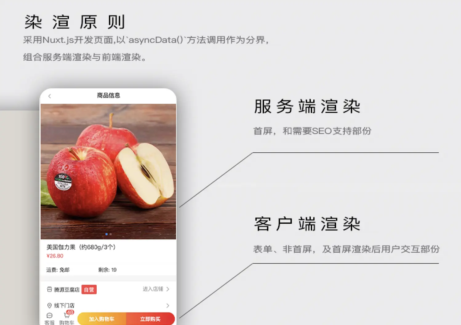 表单类、非首屏内容,主要集中体现为用户交互类,建议使用前端渲染方式进行,例如这里的点击加入购物车,利用MVVM机制,更改数据结构,驱动模板更新。