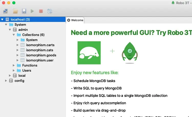参考官网安装配置 Install MongoDB ,注意设置的账号和密码,最终在 Robo 3T 可视化管理工具 中显示效果如下:
