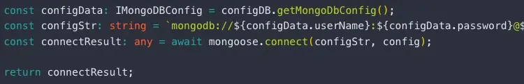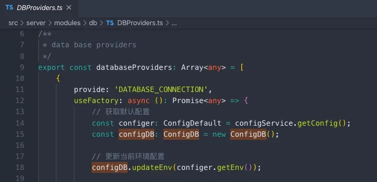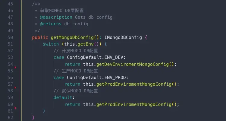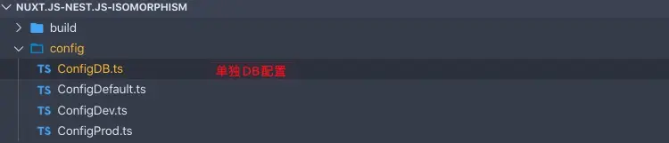 前文提到,本示例使用了前后端一体化配置,但特例情况是,对于数据库等敏感配置内容,不适合前后端共用,所以在本示例中,需要将其单独抽离。 依据环境变量,获取不同的配置 代码里边单独引用 -