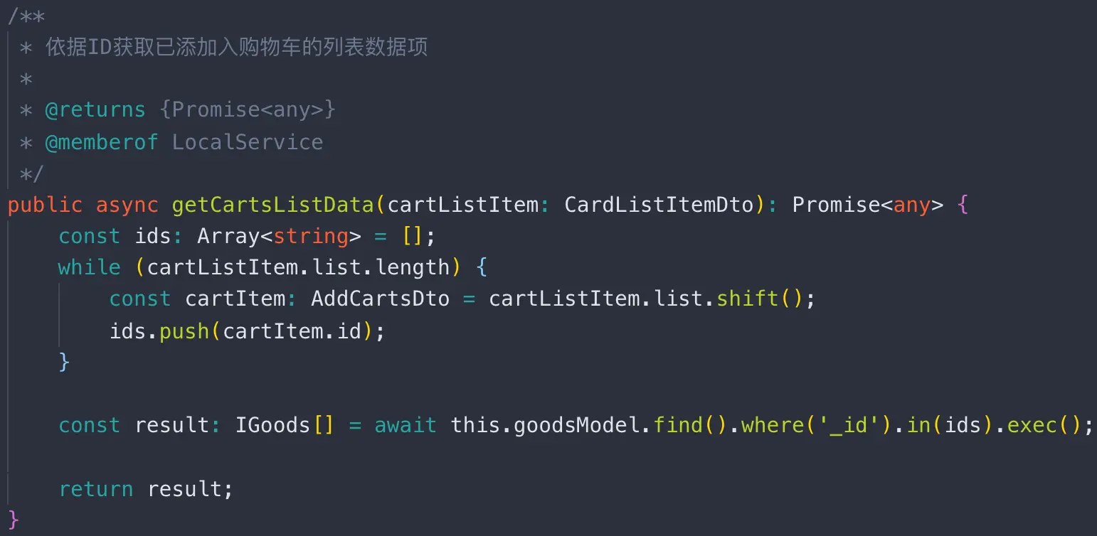 以依据ID获取已添加入购物车的列表数据项为例,model负责实际的MongoDB语句操作,整个过程都是异步的,所以需要使用async