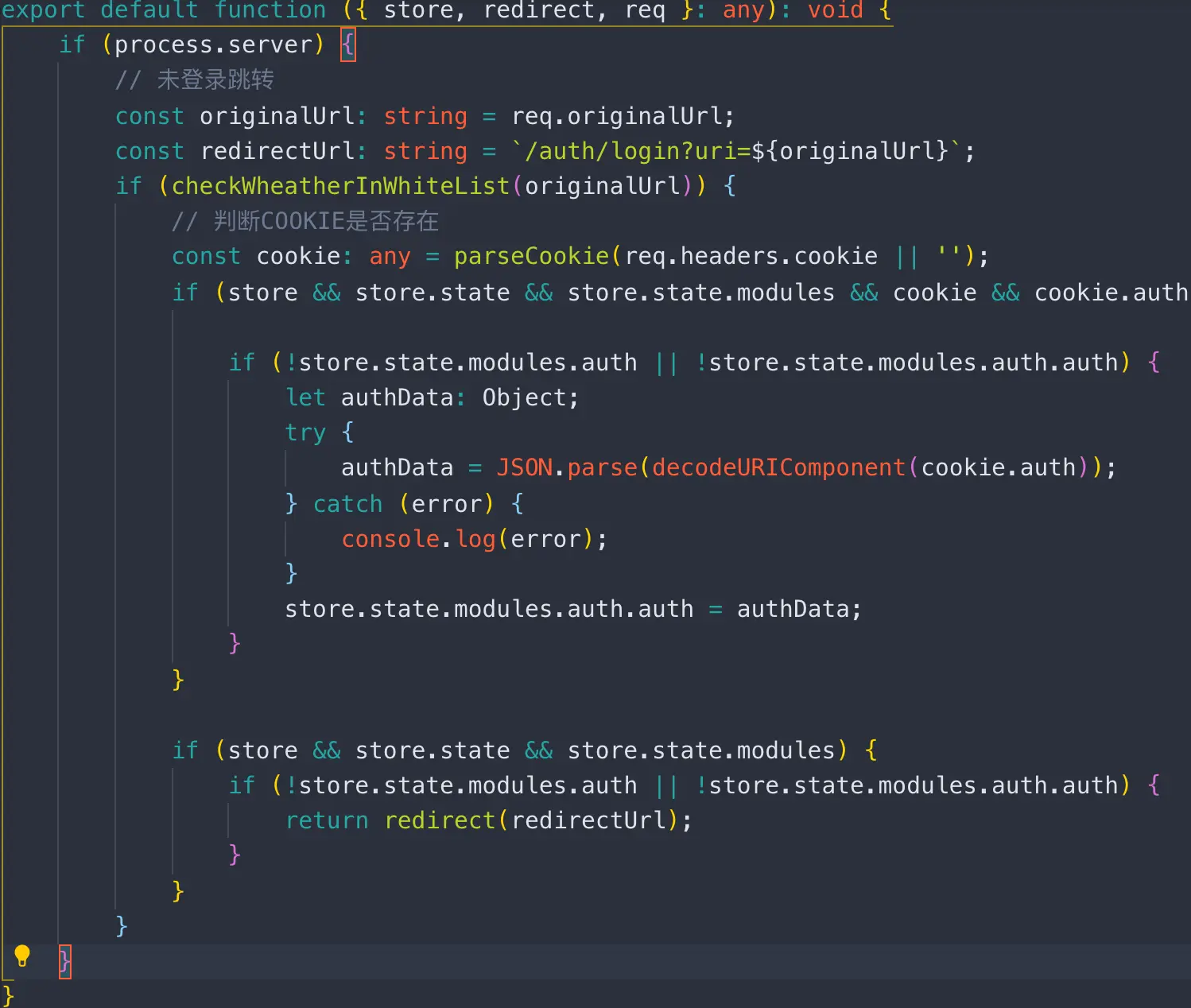 登录完成之后,需要拦截器中统一处理登录合法性校验,避免在各个业务逻辑中重复使用相同代码。在这里统一放至middleware中进行处理。