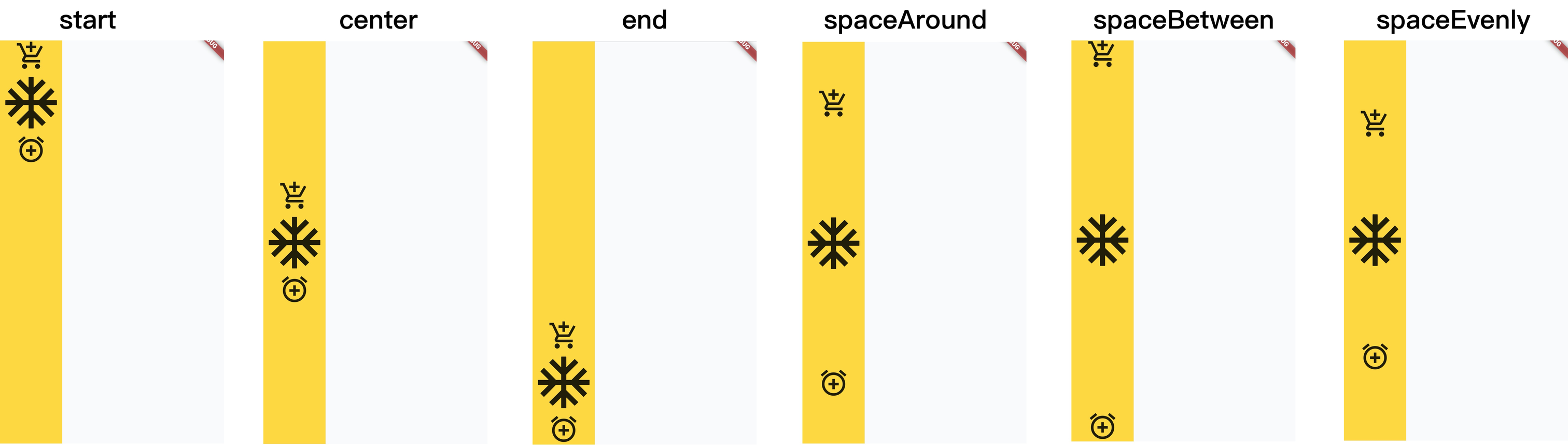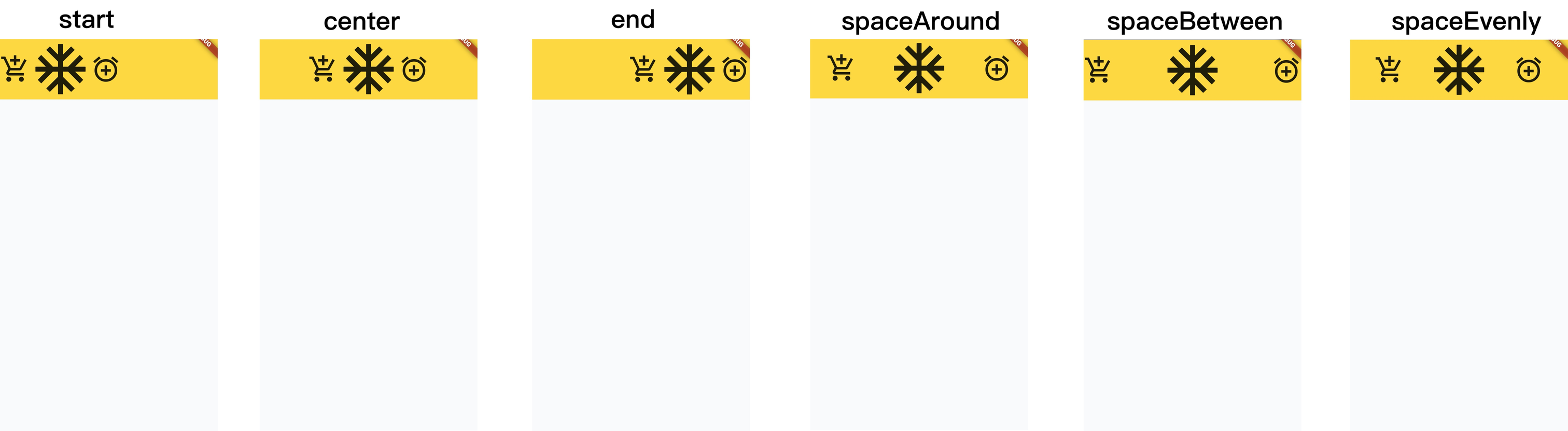 子控件在允许范围内,对齐方式包括left、center、right,flutter提供了MainAxizAligment,主轴对齐方式,有更丰富的支持,start、center、end、spaceBetween、spaceEvenly、spaceAround。