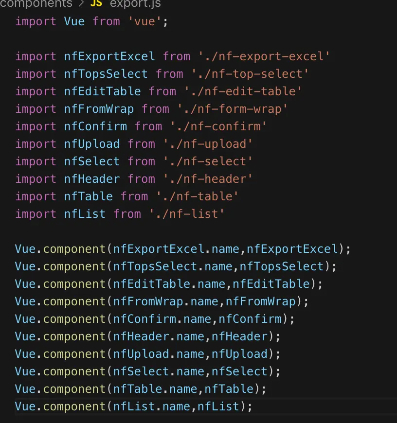 我们通常可能会在main.js(我是在compoents创建了 一个export.js ,作为我全部公共组件的导出的文件,然后在main.js引入exprot文件) 依次的导入 compents文件夹下的组件 , 再将组件 注册到Vue全局组件上。