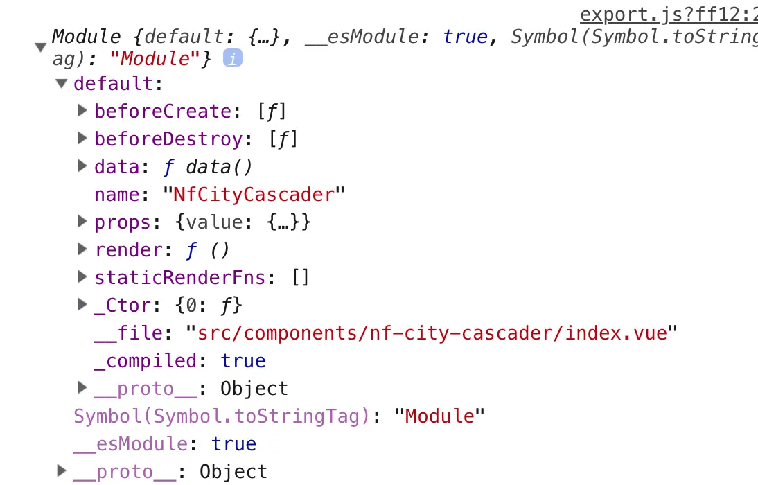 是一个Module对象,Module对象下 又一个default属性 , 这个属性就是我们这个组件的引用了。相当于 我们 import nfList from './components/nf-list/index.vue' 中的 nfList 对象。